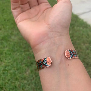 Narrow Design Bracelets. Flame painted western cuff bracelets made from copper in Southwestern design with flame painted colors and blue accents. Buy impressively unique western cuff bracelets. No polishing is required and can be easily adjusted to your wrist so you can comfortably wear them.